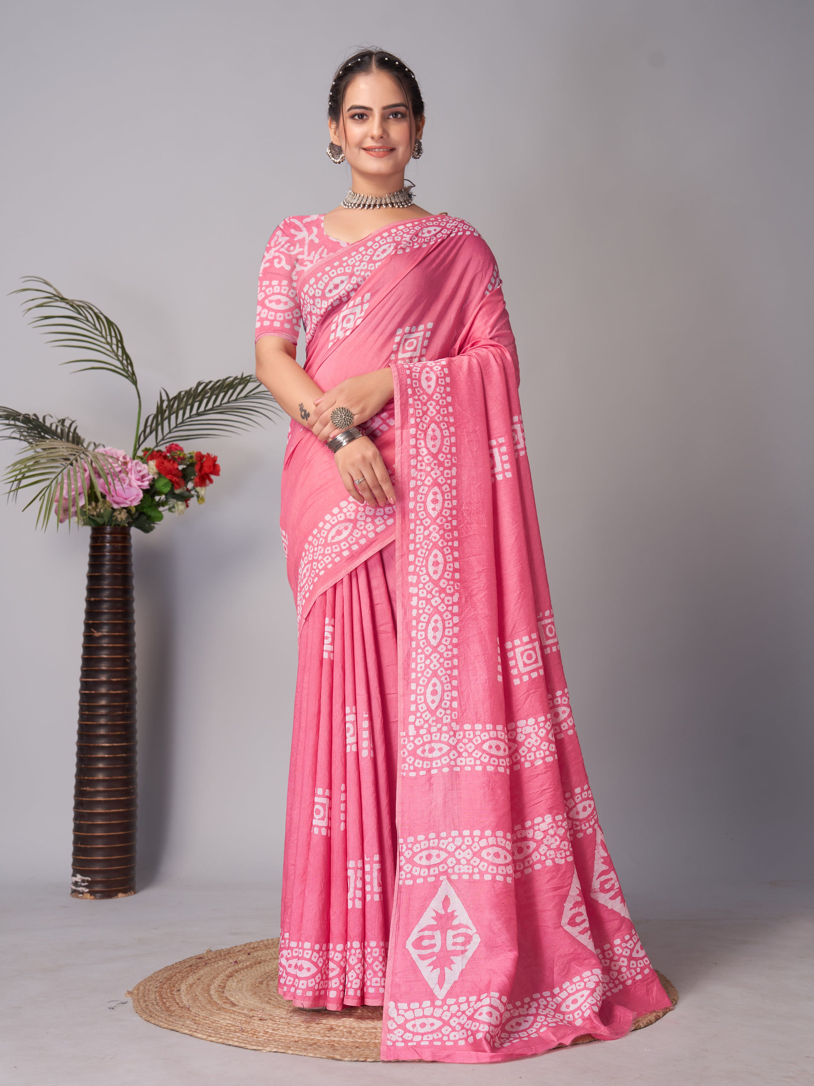 Womens Pure Mul Cotton Batik Print Pink Saree
